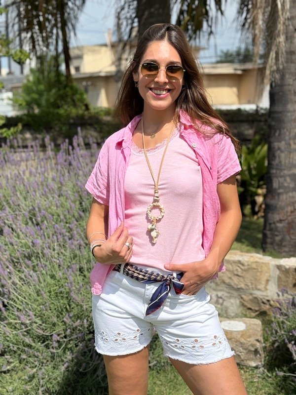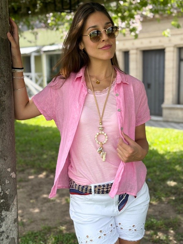 Camisa rosa manga corta de lino. Talle único, se adapta hasta un talle M.