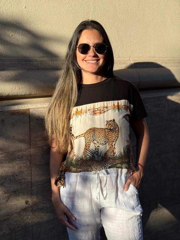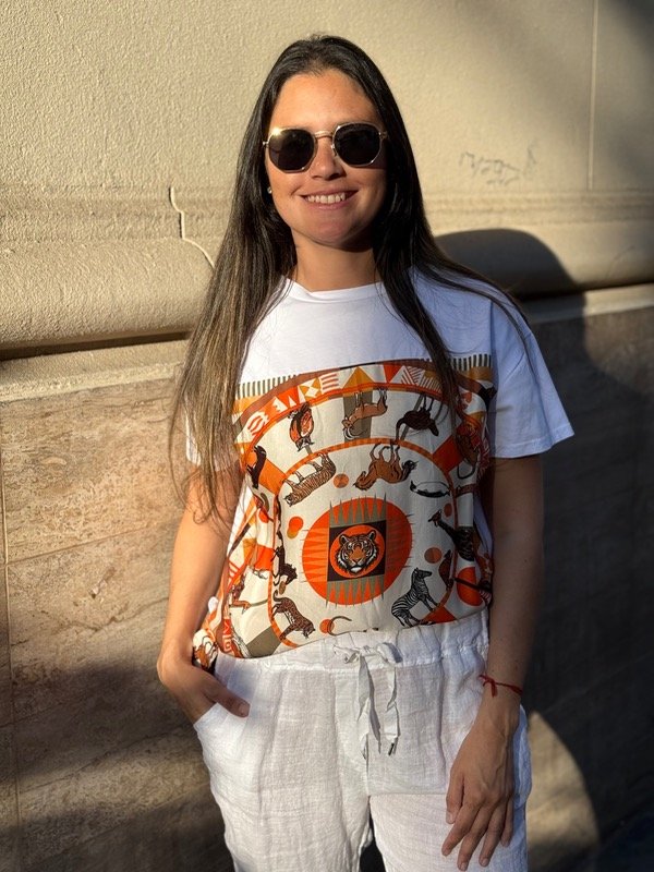 Remera de puro algodón, con estampa de seda. Talle unico se adapta hasta un L