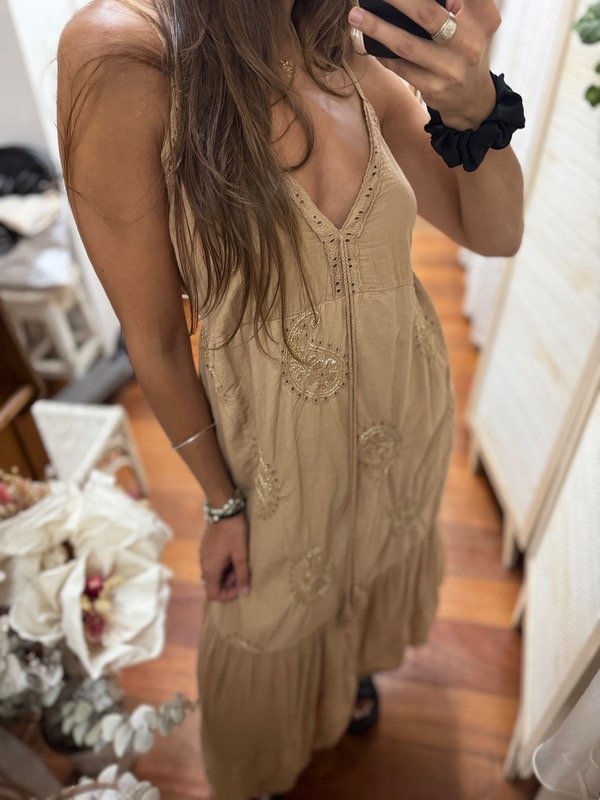Vestido de lino tostado bordado con búlgaros, con bretel regulable. Se adapta hasta un busto de 95.