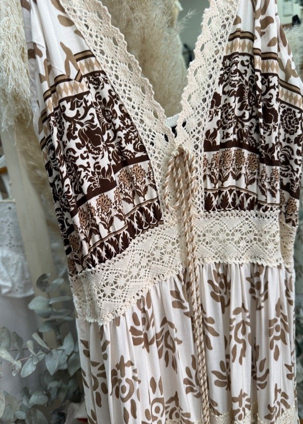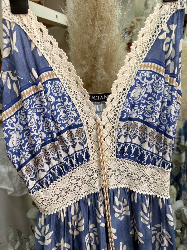Vestido largo con puntillas en busto y cordón para atar. Se adapta hasta un talle L.