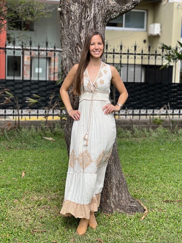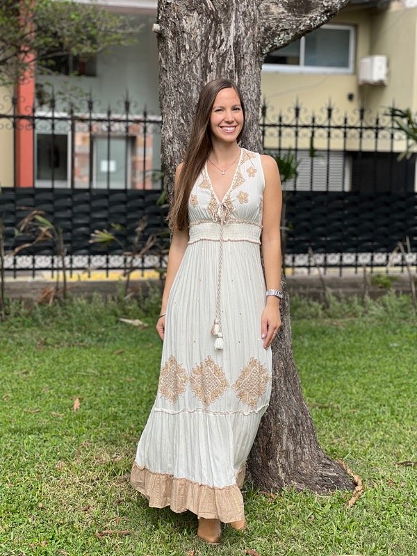 Vestido arabescos, de algodón rustico y bordado de lentejuelas. Se adapta hasta un XL. Bordado rosa y beige