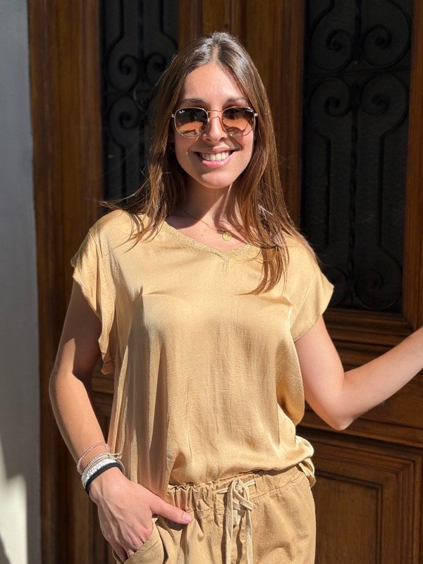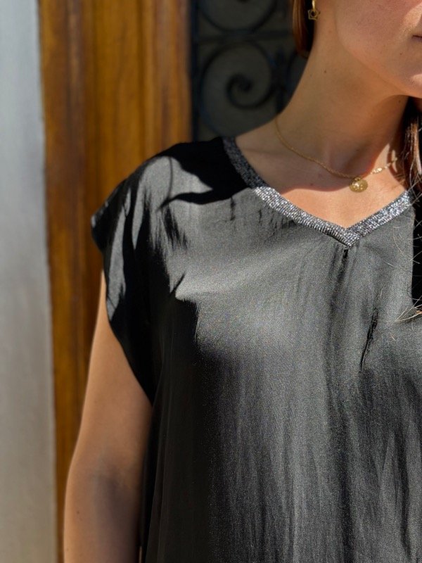 Blusa con escote en V con lurex. Disponible en colores blanco, tostado y negro. Talles únicos, se adaptan hasta un XL