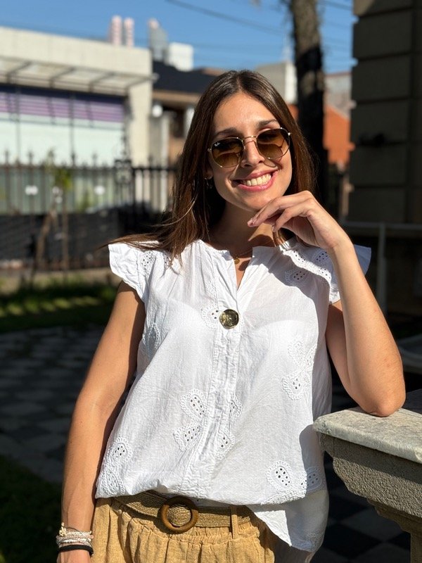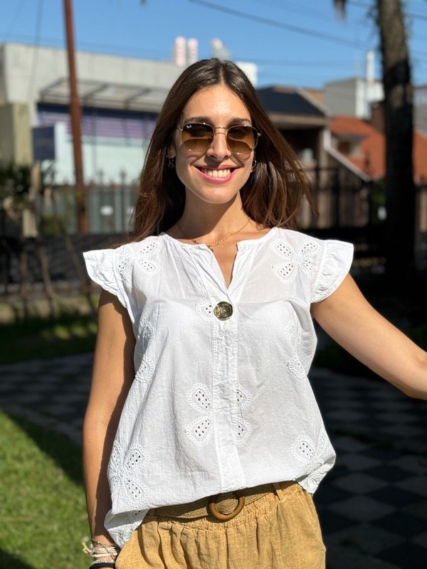 Blusa de broderie con botón. Talle único, se adapta hasta un talle XL