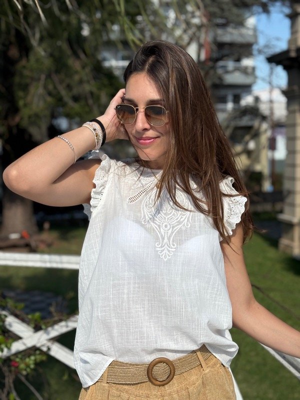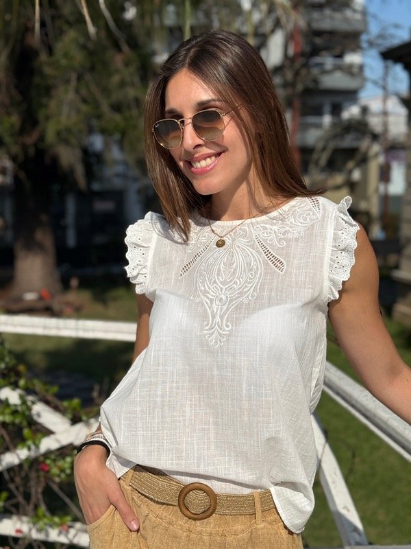 Blusa de lino bordada con volados de broderie. Disponibilidad de talles