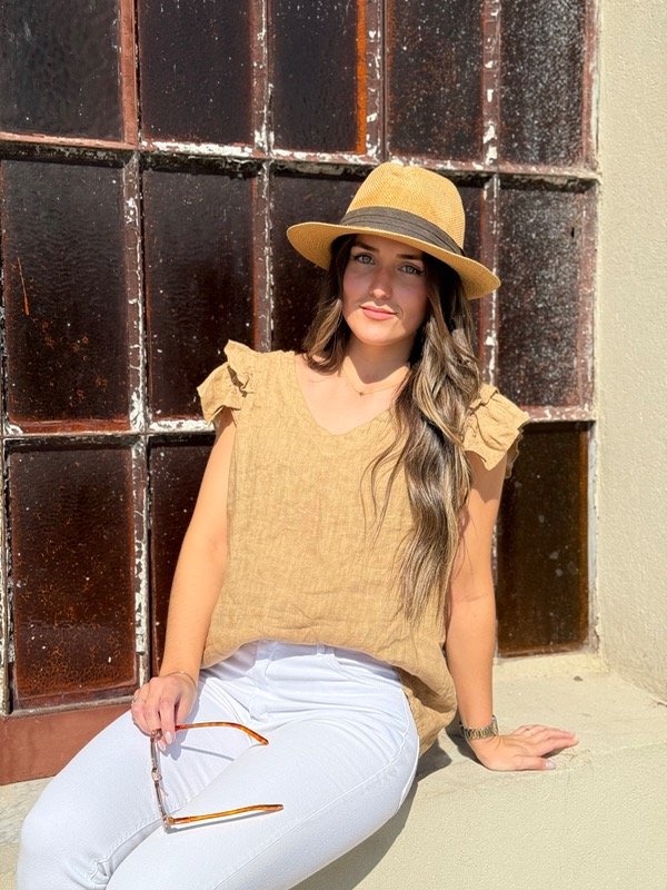 Blusa de puro lino con volados en los hombros. Unico tamaño, se adapta hasta un talle L. Viene en color tostado y verde seco.