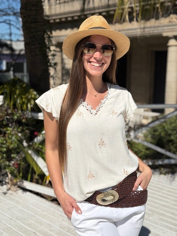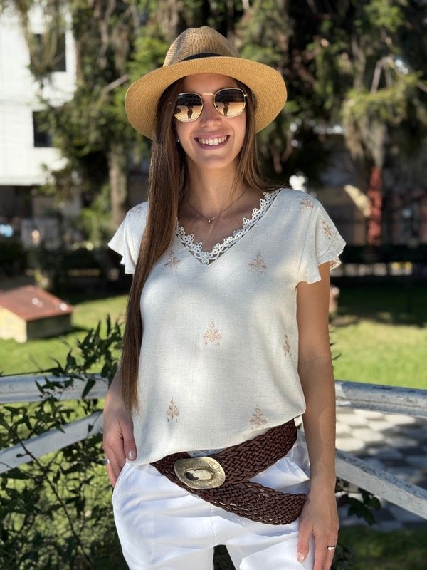 Blusa de lino cruda con bordado tostado y cuello de puntillas. Disponibilidad de talles.