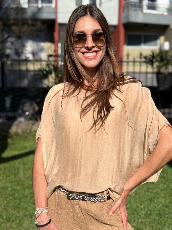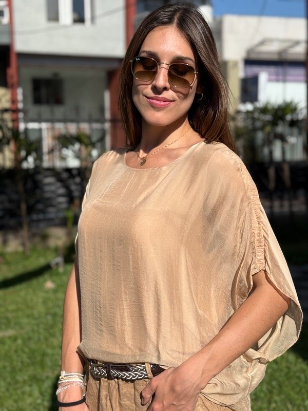 Blusa de seda beige con lentejuelas en mangas. Disponible en beige y blanco. Talle único, se adapta hasta un talle XL