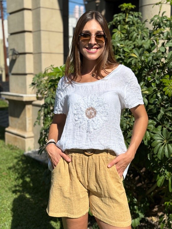 Camisola de lino bordada con detalle de lentejuelas. Talle único, se adapta hasta un talle XL