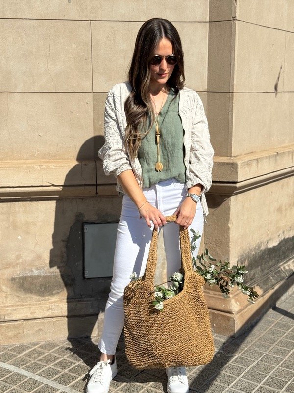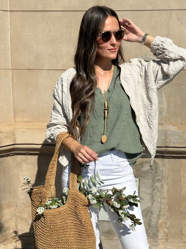Campera de lino bordada color cemento. Unico tamaño. Se adapta hasta el talle L.