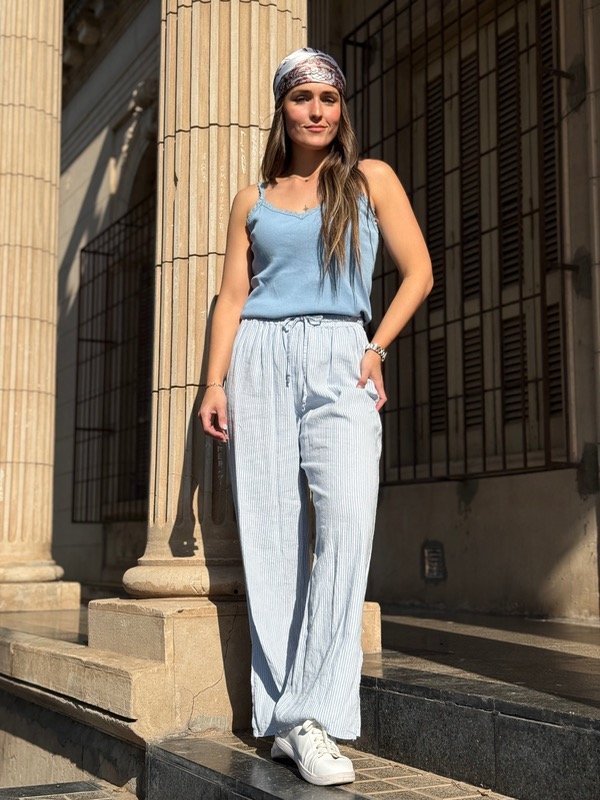 Palazo rayado de lino. Disponible en rayada celeste y beige.