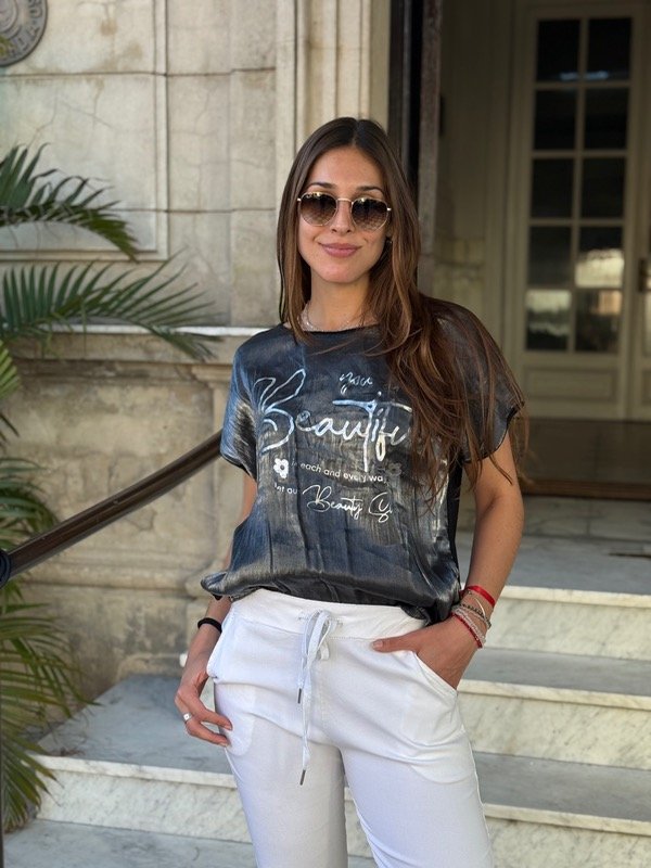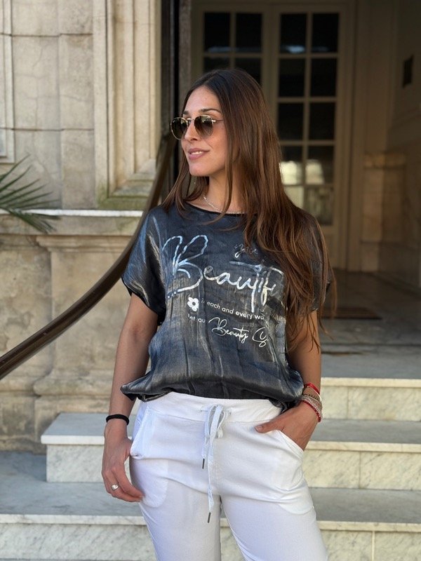 Remera de satén negra con espalda de algodón. Talle único, se adapta hasta un XL.