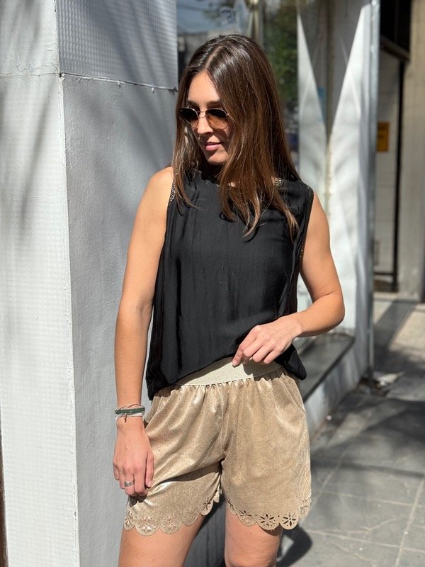 Short de gamuza brilloso con elastico en cintura. Se adapta hasta un talle XL