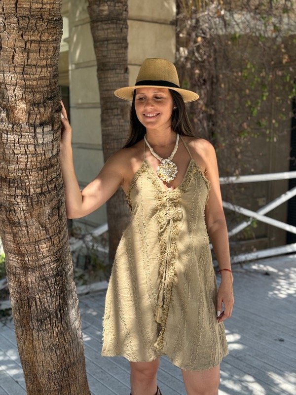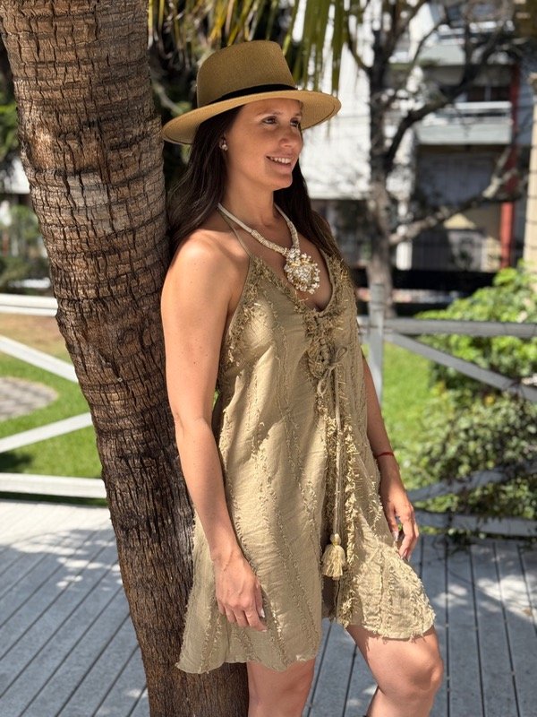 Vestido de algodón corto beige. Talle único, con elástico en la espalda, se adapta hasta un talle L.