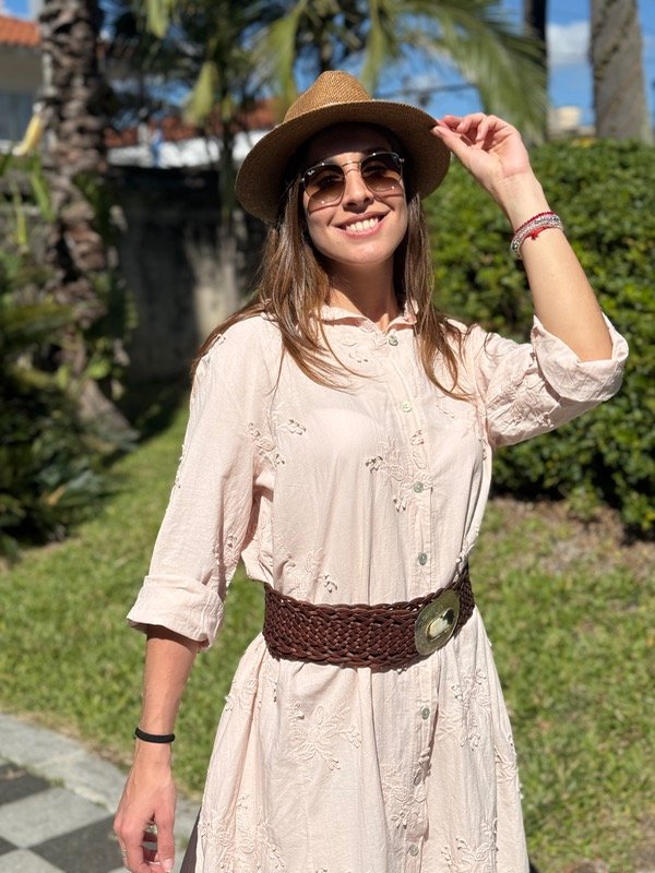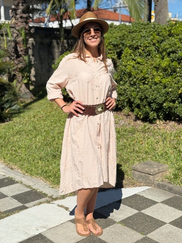 Vestido camisero rosa bordado largo, se adapta hasta un talle XL.